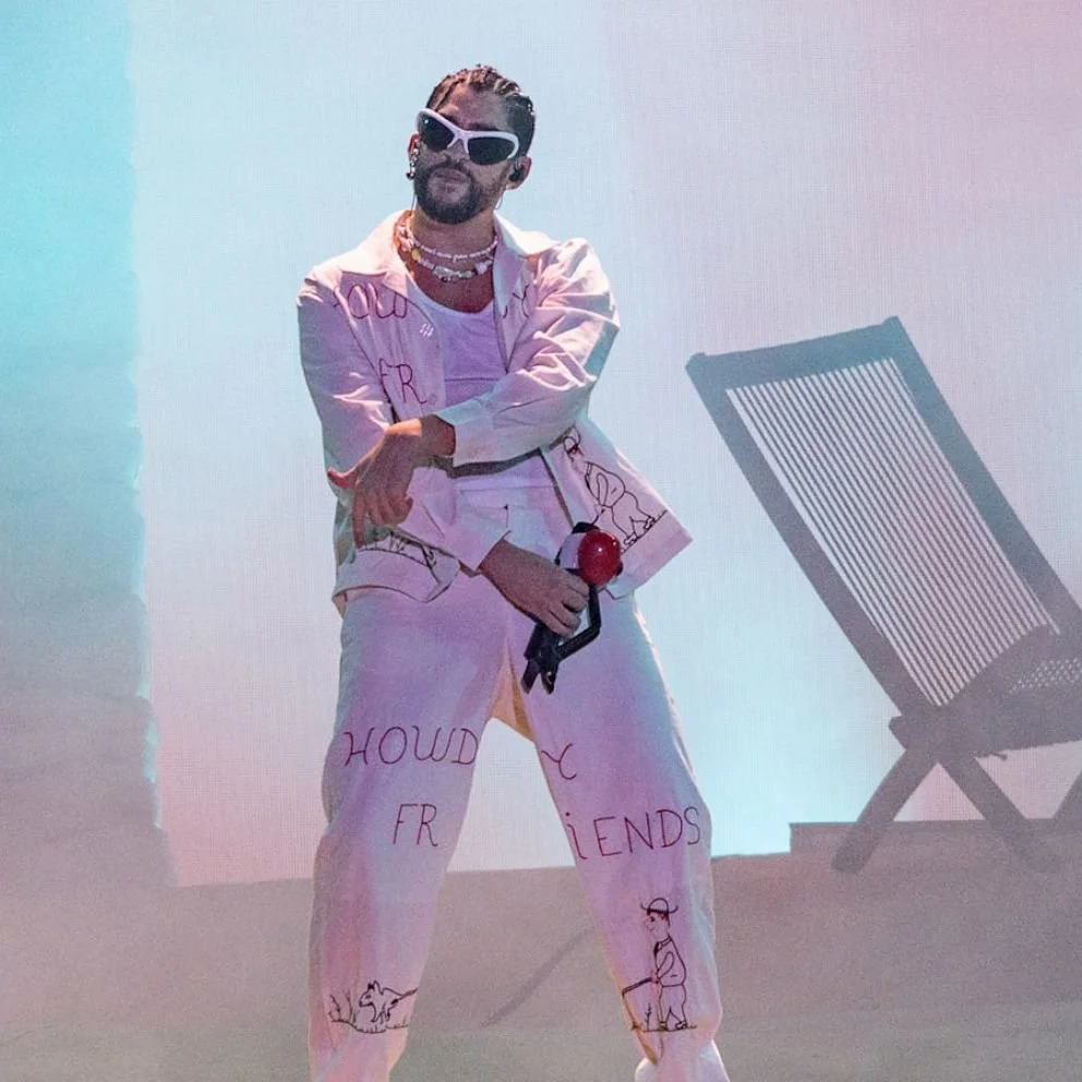 For a live performance, Bad Bunny opted for a hand-painted white suit that felt raw, personal, and intentionally unpolished. Covered in doodle-style illustrations and handwritten text, the look leaned into self-expression rather than refinement — more sketchbook than showroom. Paired with layered necklaces and signature white sunglasses, the outfit embodied the fearless experimentation that defined his early performance style, where clothing became part of the message rather than just the moment.