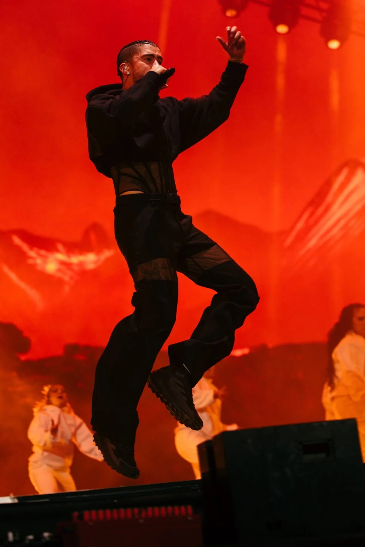 Louis Vuitton–inspired custom puffer, Bad Bunny marked a defining early-career moment on stage in Los Angeles. The oversized purple-and-yellow quilted jacket leaned fully into volume and color, turning utility into spectacle and streetwear into statement. Designed to read from stadium distance, the padded texture and bold palette made movement visible under the lights, long before tailoring and couture became his signature. Worn during his SoFi Stadium performance—coinciding with the city officially declaring October 1st as Bad Bunny Day—the look captured an artist still experimenting, still loud, and already commanding space through style alone.