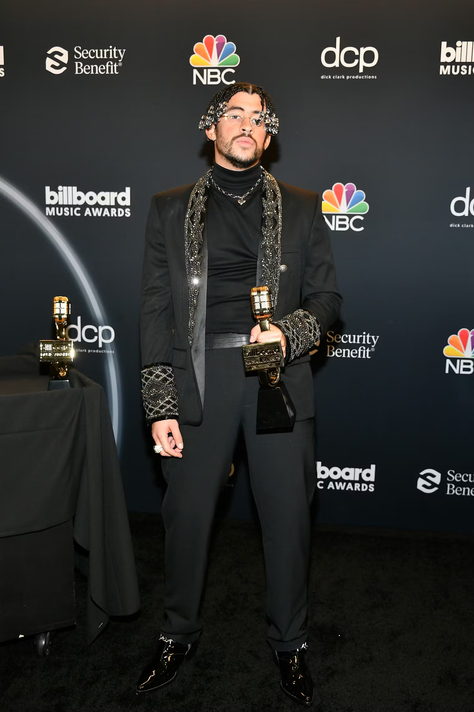 At the 2020 Billboard Music Awards, Bad Bunny turned his win into a full fashion moment, arriving in a look that felt celebratory yet unmistakably his own. Wearing a custom Balmain design by Olivier Rousteing, the all-black ensemble was elevated through intricate embellishment—crystal-trimmed lapels, textured cuffs, and jeweled hair details that caught the light with every movement. Trophy in hand, the look read confident, intentional, and unapologetically theatrical—proof that even in moments of recognition, Bad Bunny uses fashion to amplify presence, not just polish it.