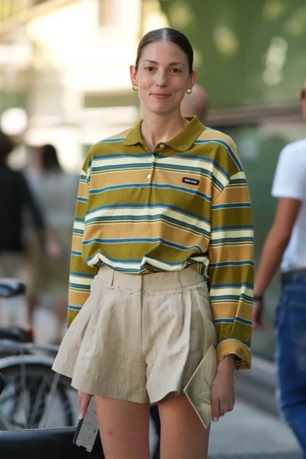 This is where the polo knit leans more casual. A striped or relaxed-fit style paired with tailored shorts feels sporty, but still intentional. The looser top keeps the outfit from feeling too polished, while the shorter hemline makes it feel lighter and more current. It’s an easy combination, but one that softens the traditionally preppy feel of a polo.