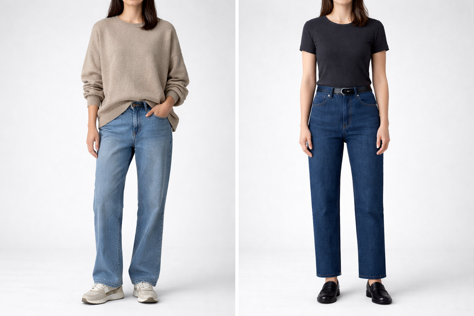 One relaxed option (such as a clean wide-leg or softly structured barrel jean).