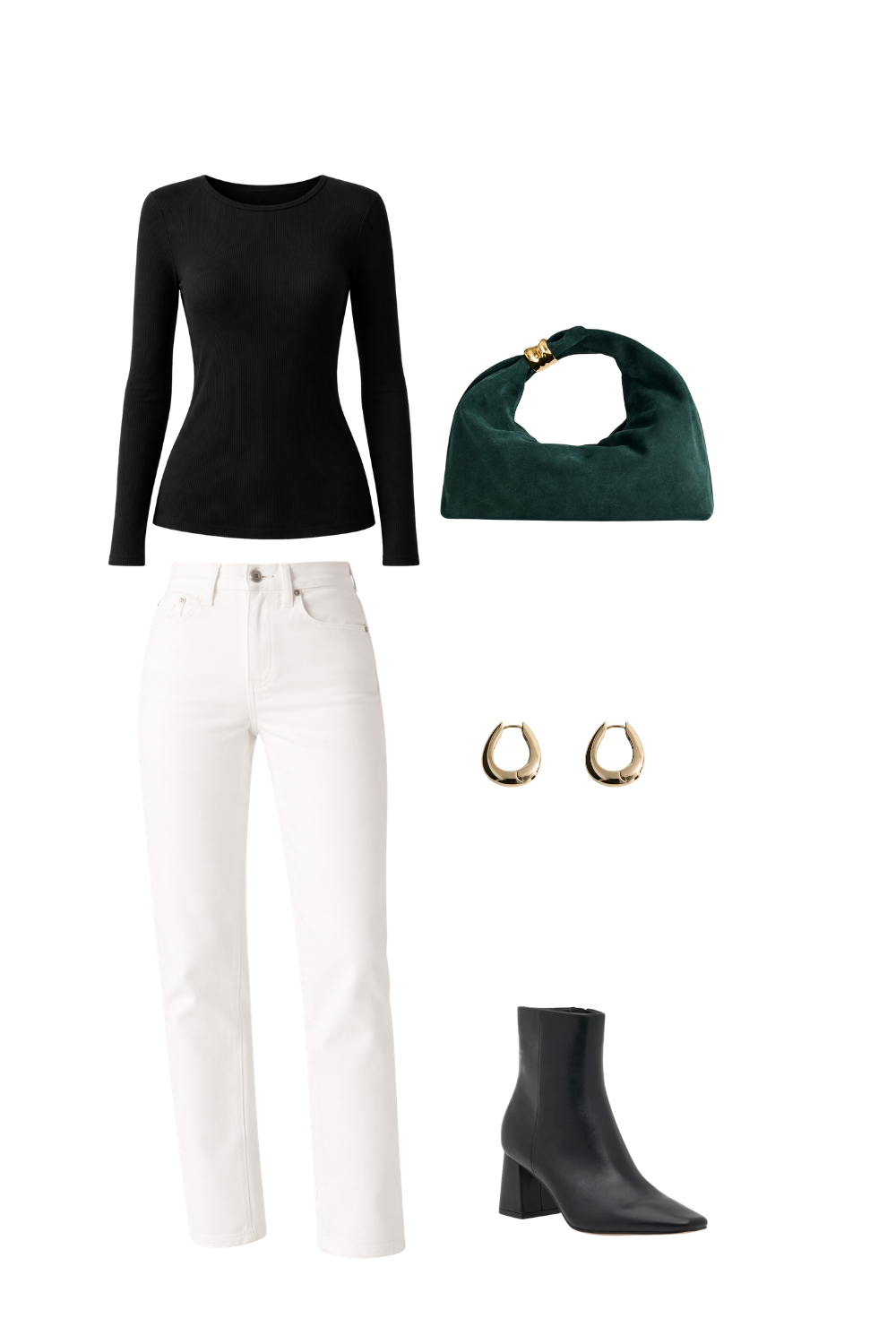 White straight-leg jeans feel sharp and intentional when anchored with a fitted black long-sleeve knit that defines the upper half. A structured emerald clutch adds a single, controlled pop of color, while gold hoop earrings warm up the contrast without overpowering it. Finish with sleek black ankle boots to keep the line clean and modern. This is how to style jeans after dark — high contrast, one focal point, and zero excess.