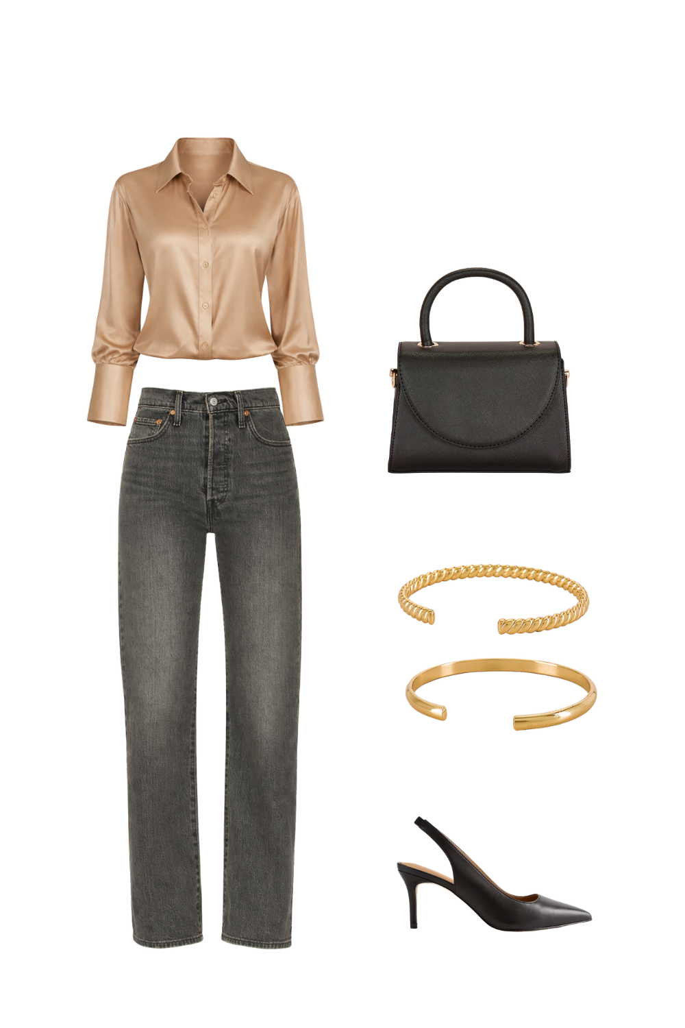 Charcoal straight-leg denim paired with a satin champaign colored blouse, proves you don’t need more accessories, you need better texture. If you’ve ever wondered how to style jeans for dinner, this is the formula: sleek base, mini purse, gold cuffs, and a clean heel. Let the fabric elevate the look.