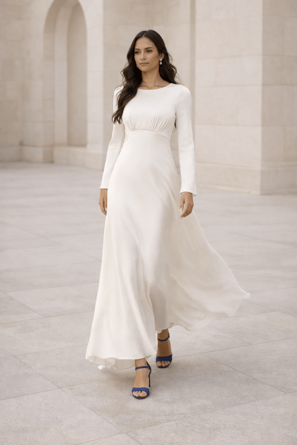 A long sleeve flowy elopement dress like this feels timeless and elegant, while the lightweight fabric keeps the silhouette soft and easy to move in.