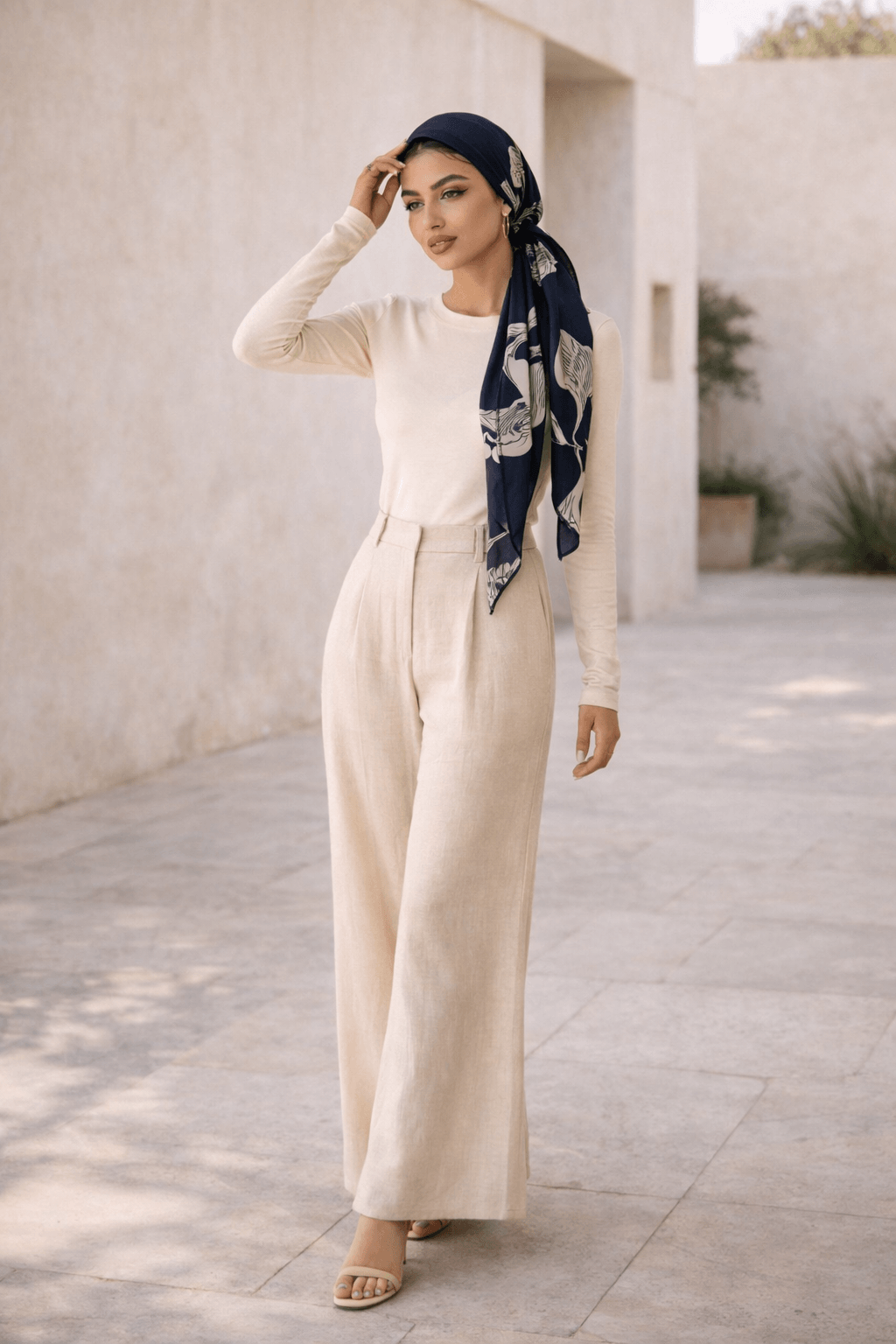 Fold a large square scarf into a triangle and tie behind the back. This turns the scarf into the focal point. Pairing it with wide-leg pants keeps the proportions balanced.