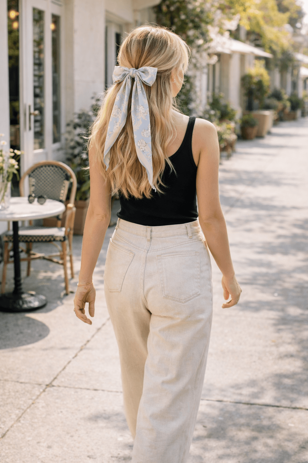 A loose scarf bow adds softness and movement to a minimal outfit.