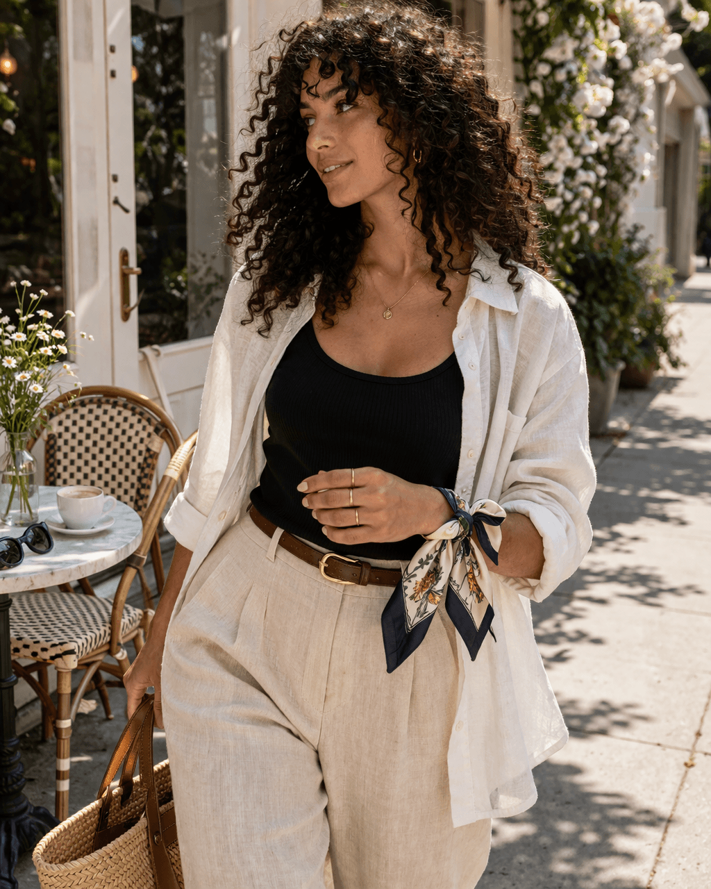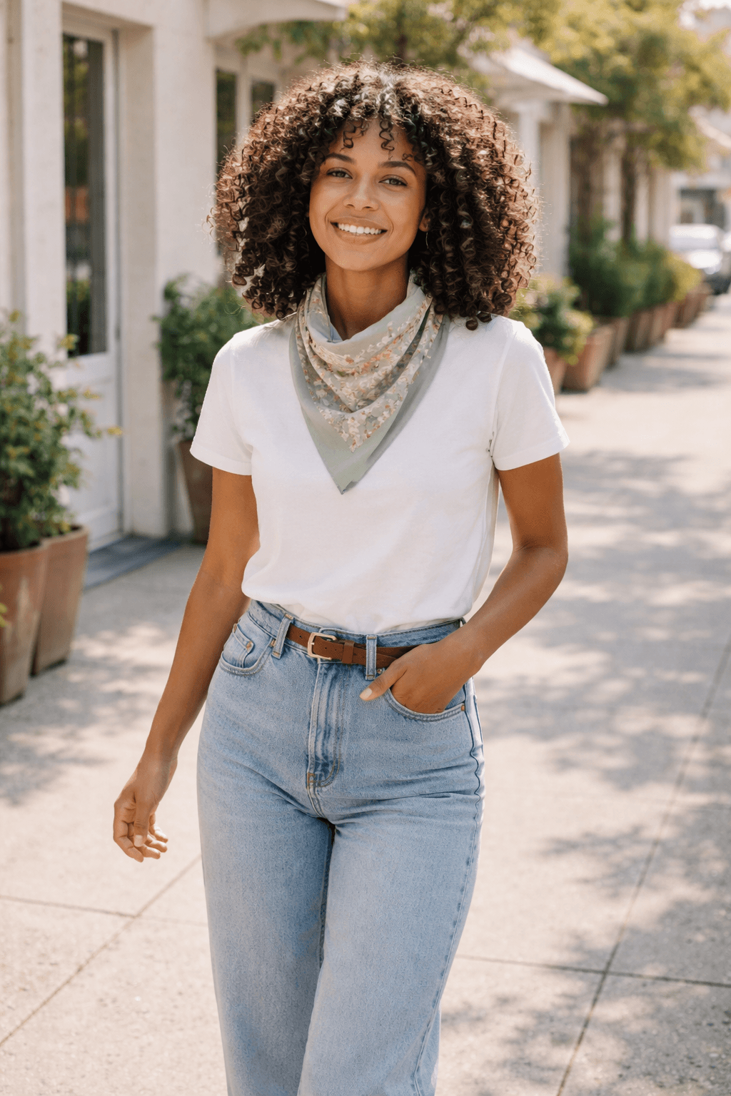 A loosely tied scarf at the neck adds softness to a simple summer outfit without feeling overstyled.