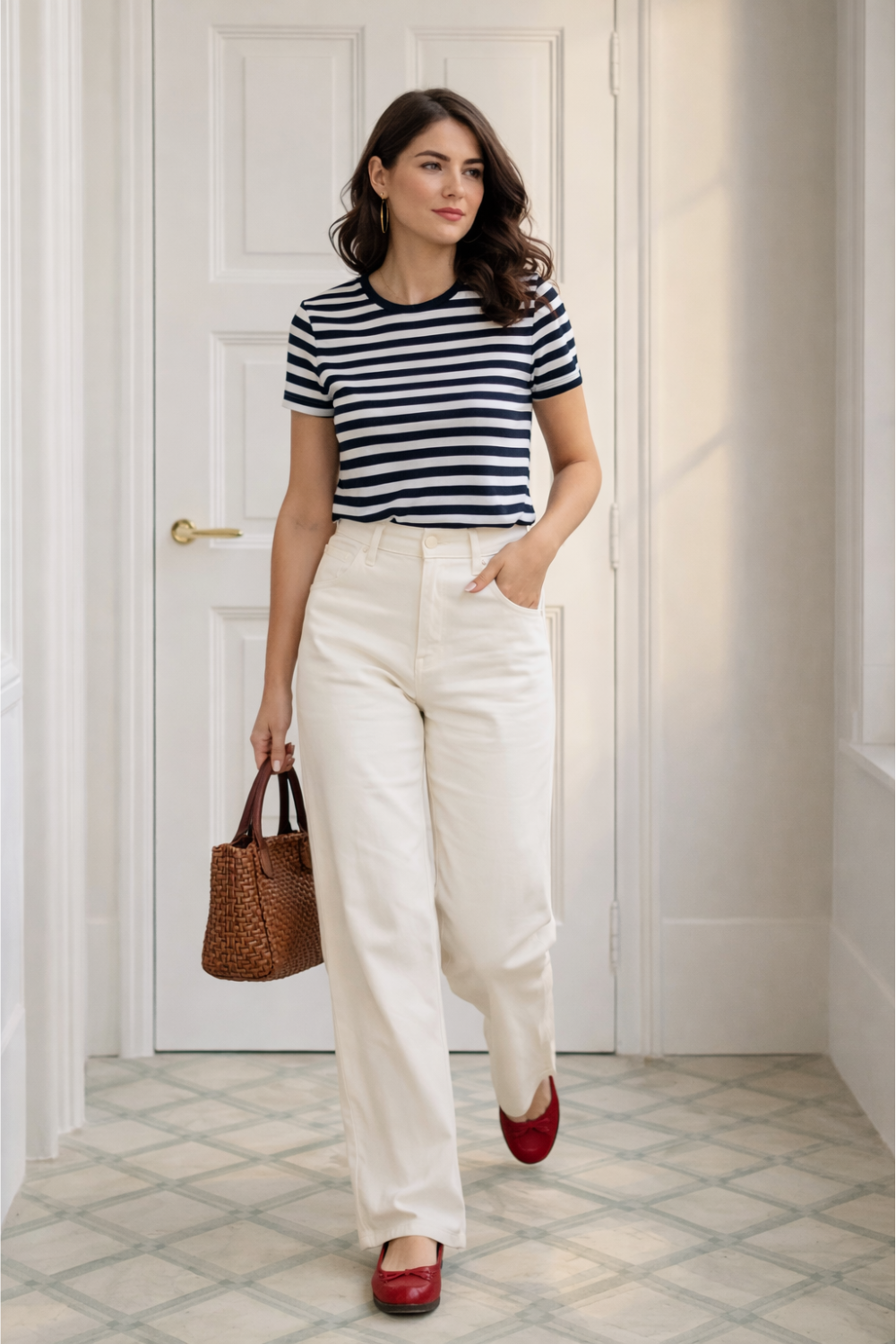A striped tee paired with tailored trousers creates an easy outfit that feels classic but still polished.