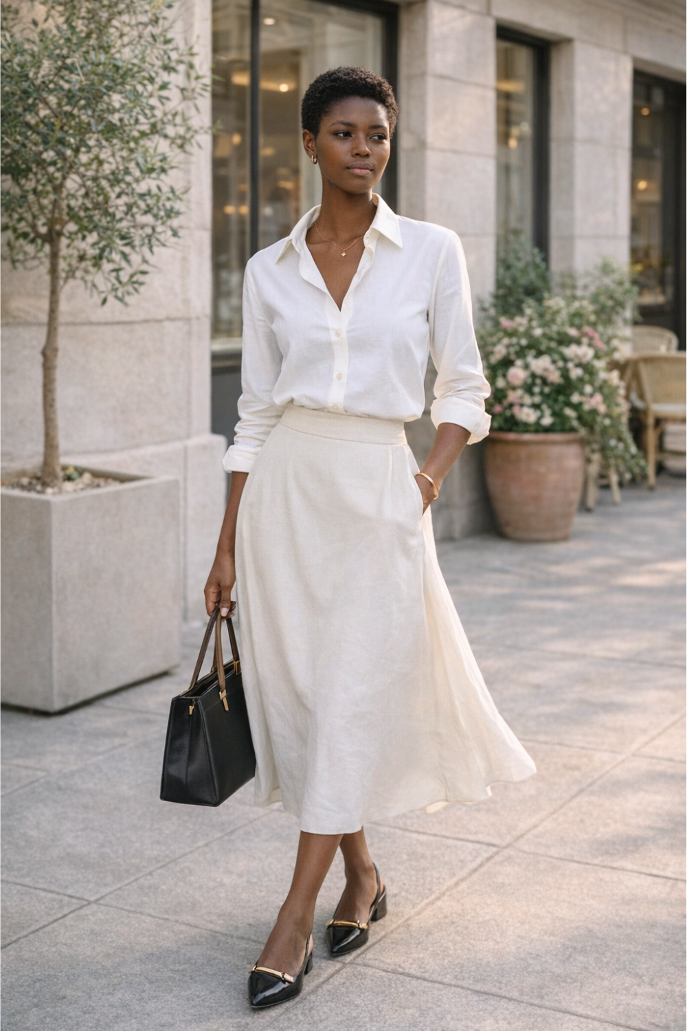 Outfit formula: structured shirt + flowing skirt creates balance between tailored and feminine.