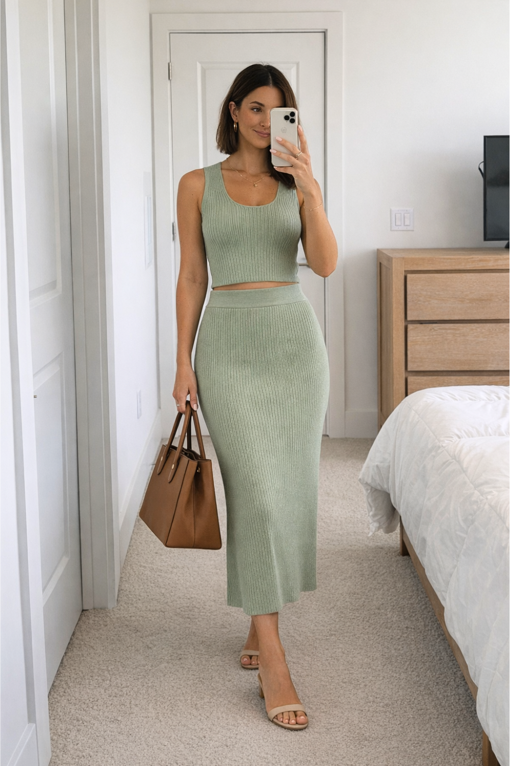 A midi skirt paired with a knit top creates one of those quietly elegant silhouettes that never really goes out of style.