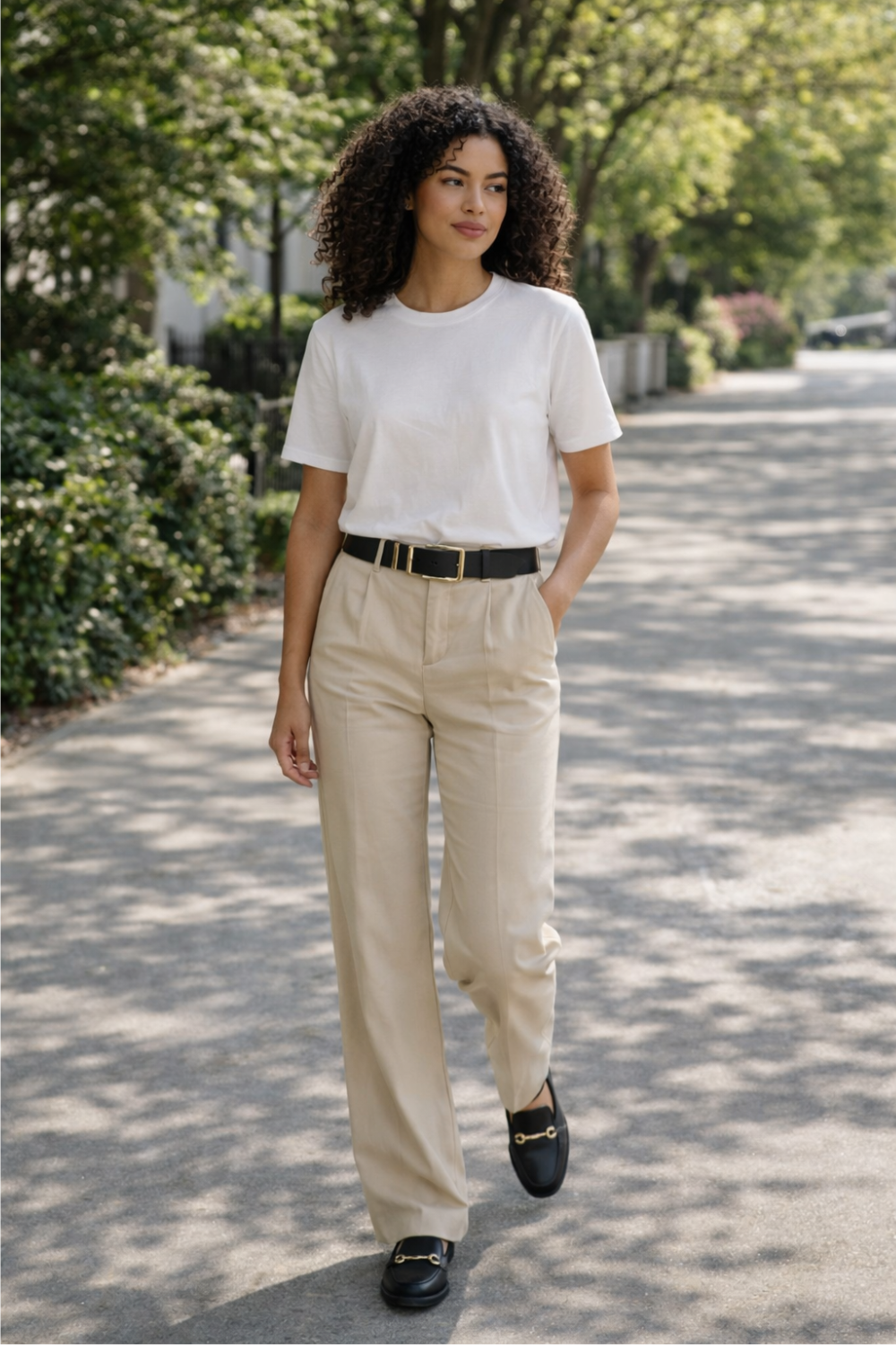 The simplicity of the tee softens the formality of the trousers, making the overall look feel approachable.