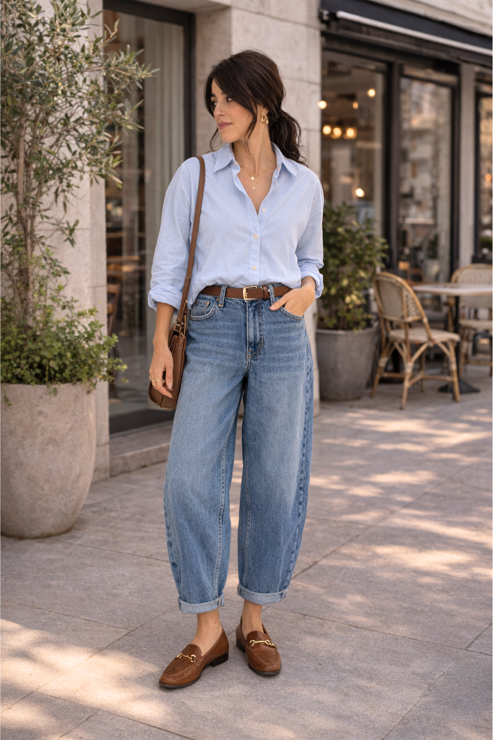 The curved silhouette of the denim makes the look feel modern, while the classic shirt keeps everything grounded.