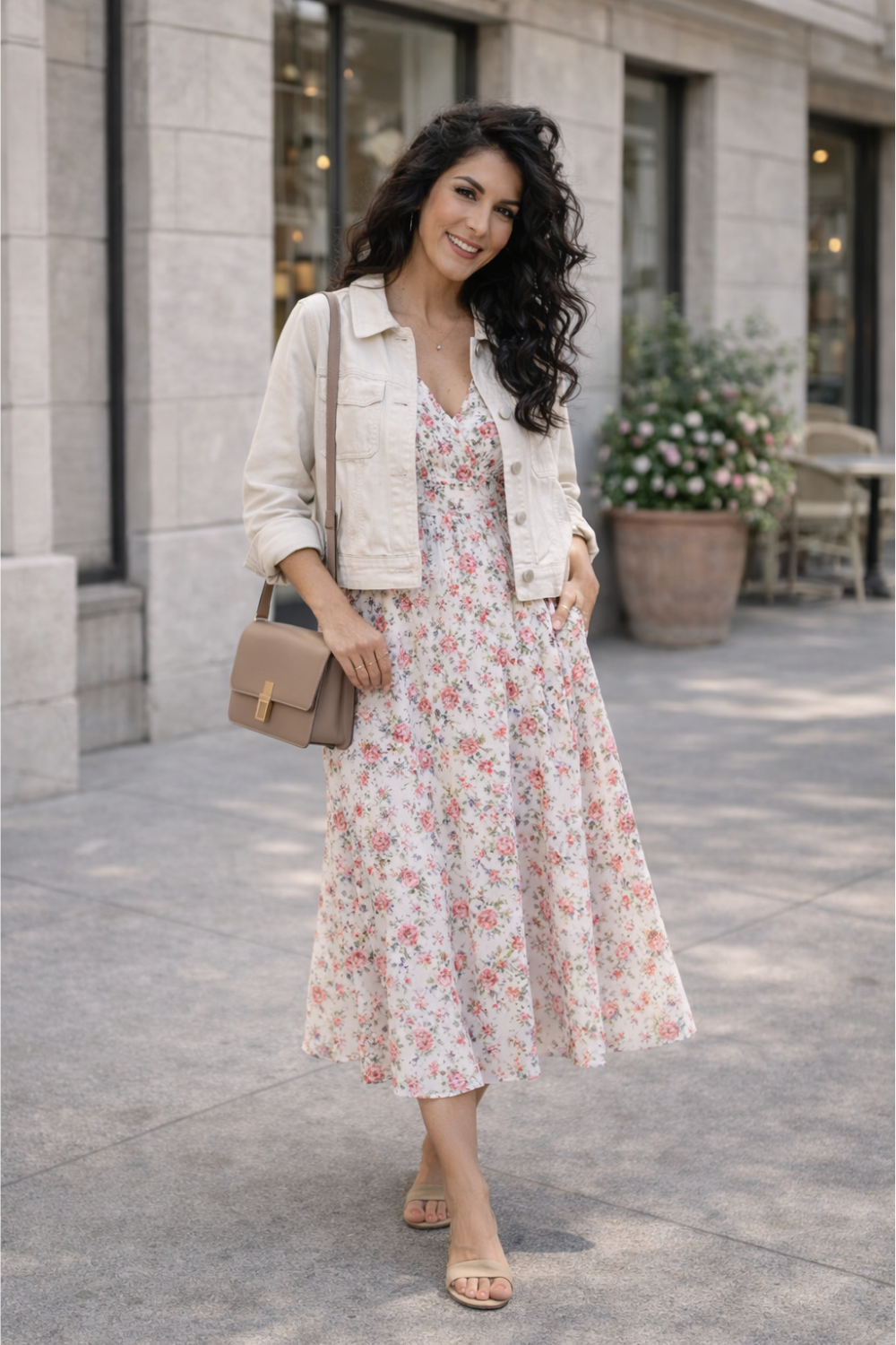 A light jacket helps floral dresses feel practical for unpredictable spring weather.