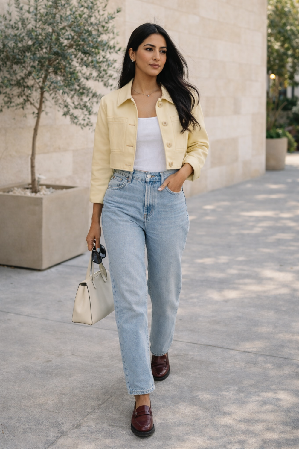 Cropped jackets naturally highlight the waist when paired with high-rise denim, making the outfit feel balanced and modern.