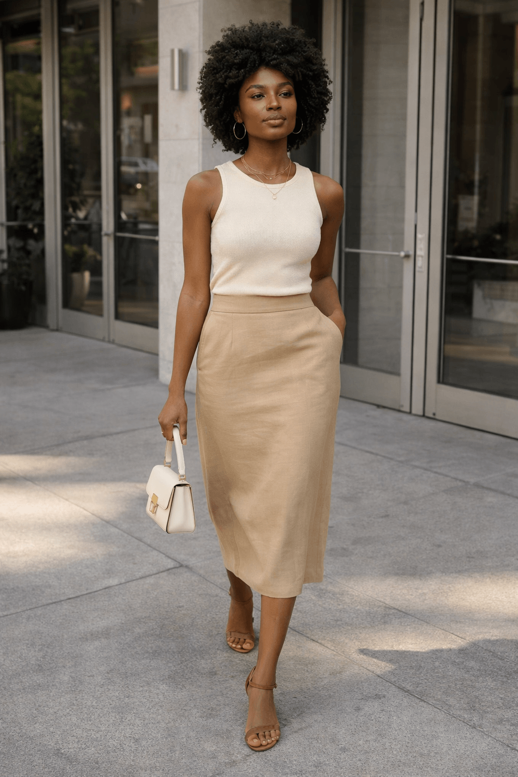 This works because the structured skirt and clean top elevate the neutral palette into a polished everyday look.