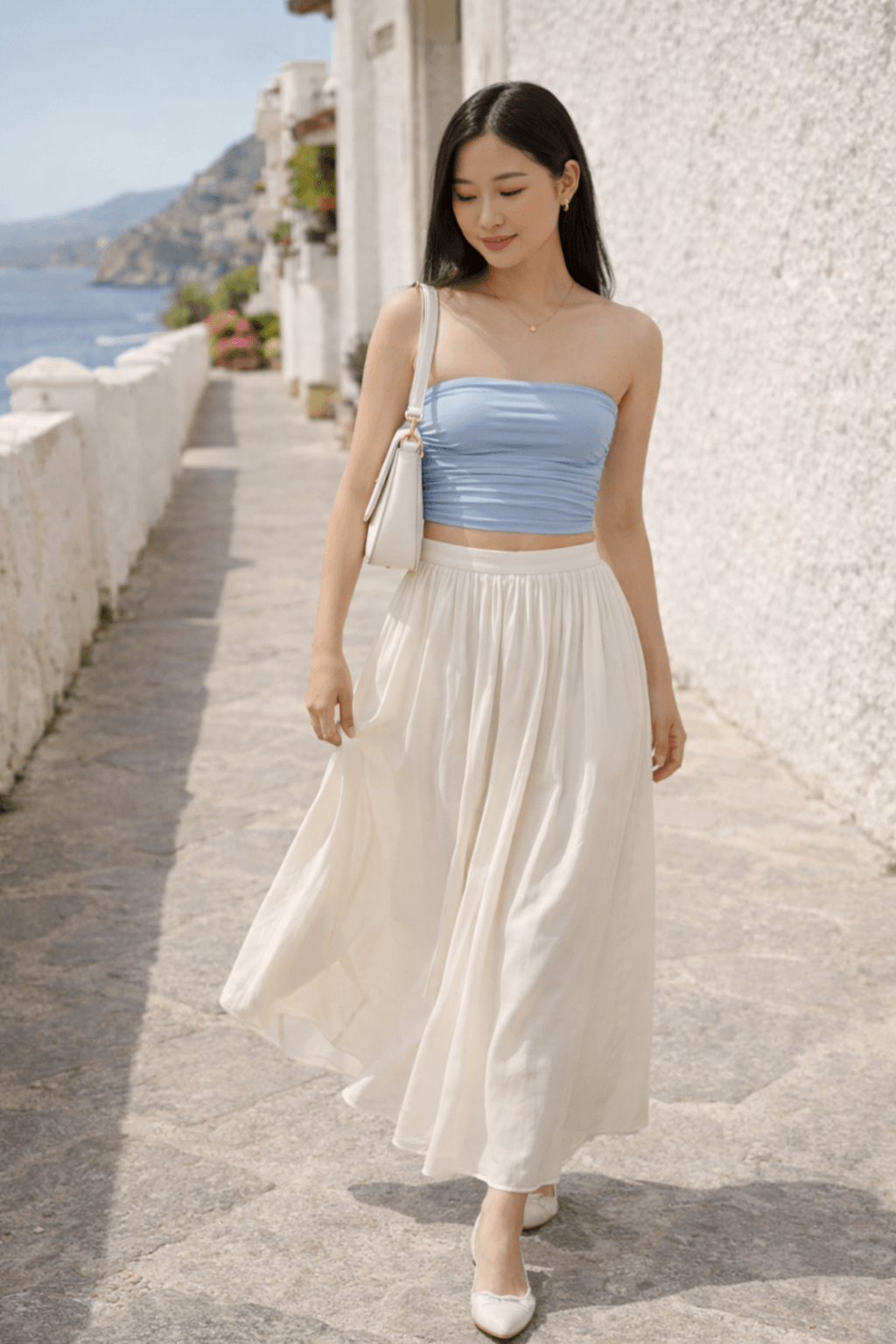 Tip: Let one piece bring the movement. Soft draping and lightweight fabric keep the outfit airy instead of overwhelming.