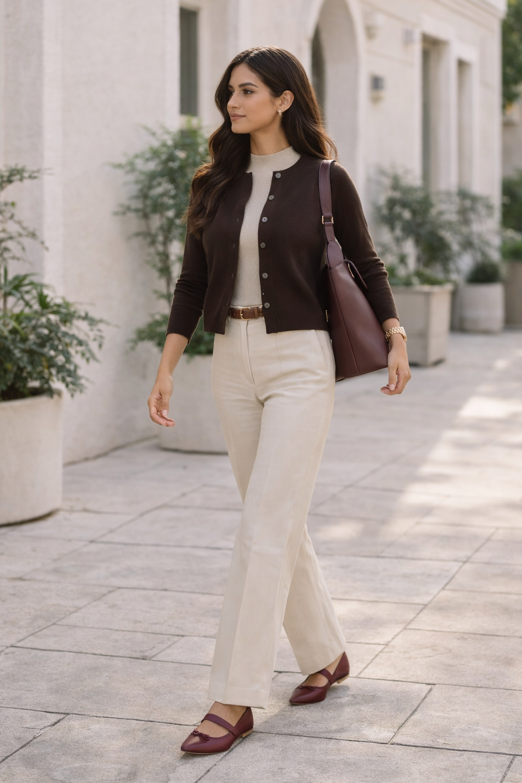The fitted cardigan adds warmth and shape, while the lighter trousers keep the outfit feeling seasonal.